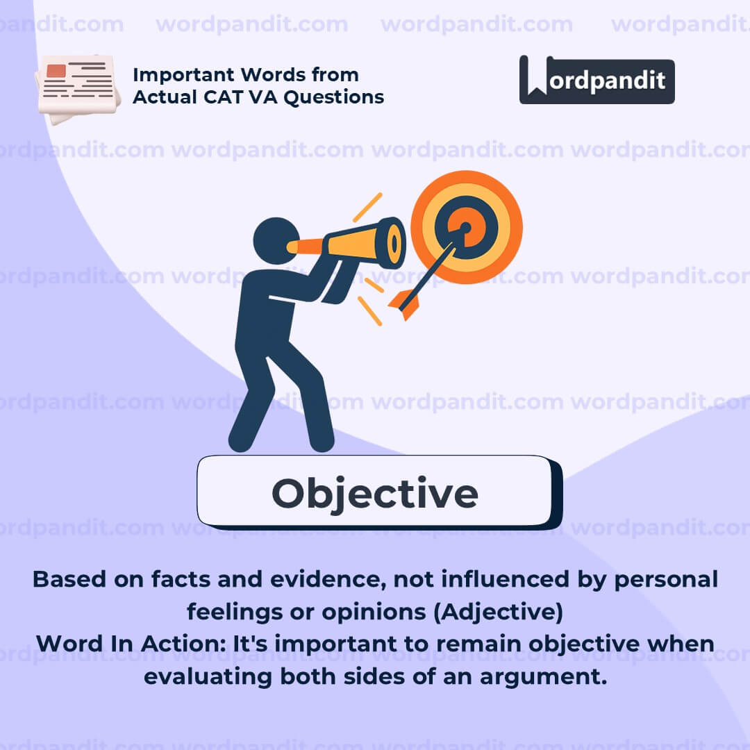 This is a key word in academic and scientific writing. Use “objective” when discussing fairness, neutrality, or evidence-based conclusions. It often contrasts with “subjective,” which involves personal views or emotions.