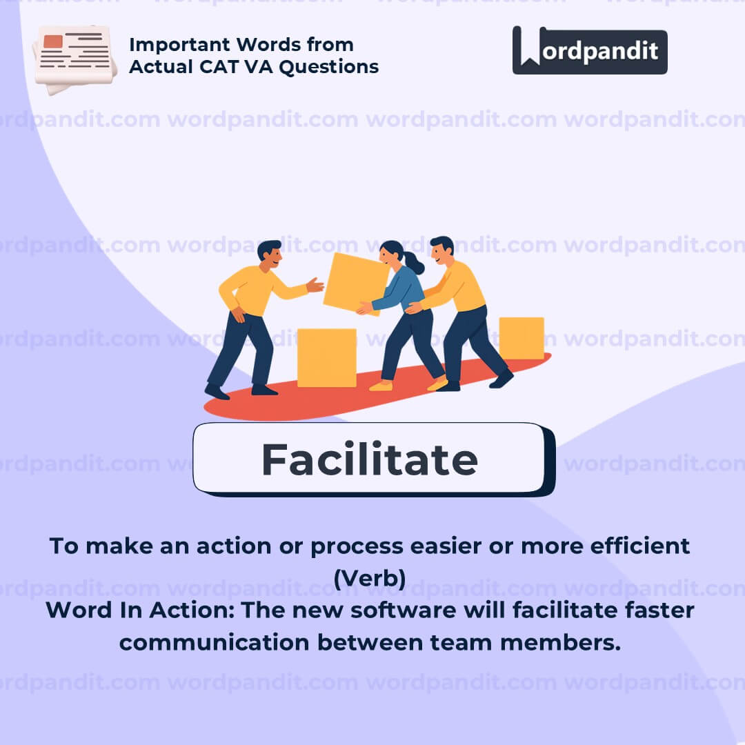 To “facilitate” something is to smooth the path. Whether it’s a teacher facilitating a discussion or a bridge facilitating travel, the word is all about support, ease, and progress. Remember: you’re not doing the task—you’re making it easier to happen.