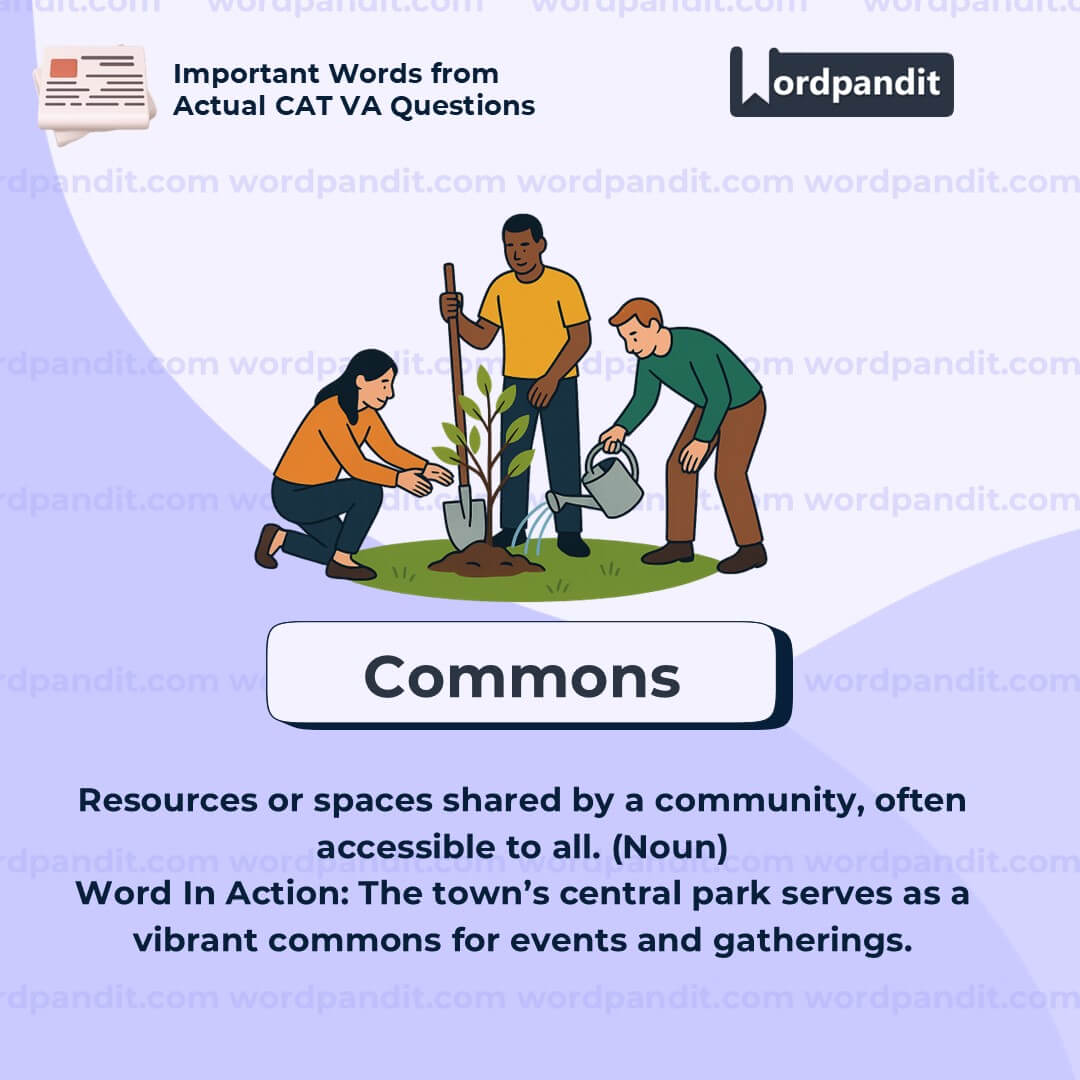 Meaning: Resources or areas that are shared by a community and accessible to all members of that group (Noun â plural)