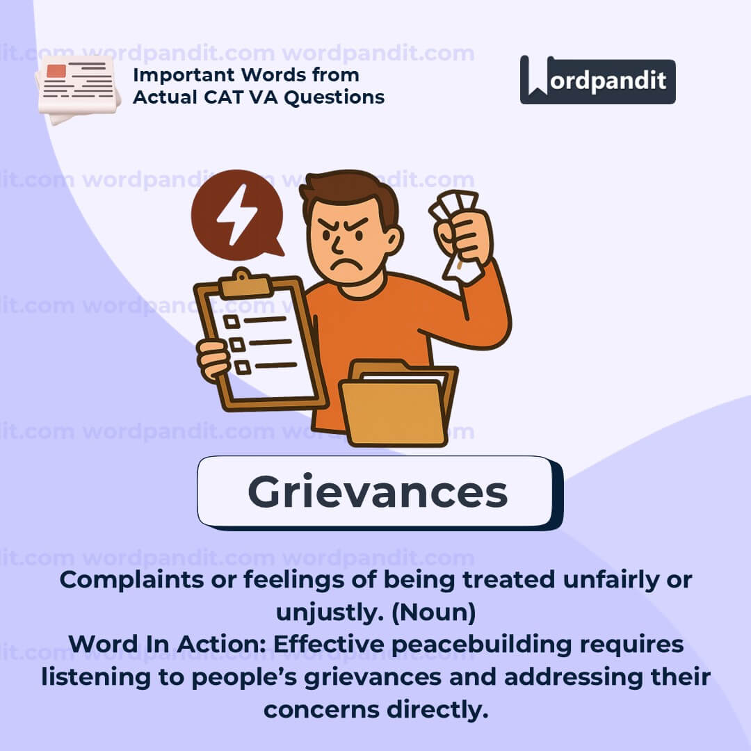 This is a strong word often used in conflict resolution, labor rights, and political dialogue. Always connect it to the idea of justice or fairness. Ask yourself: *What is the person or group complaining about, and is it justified?*