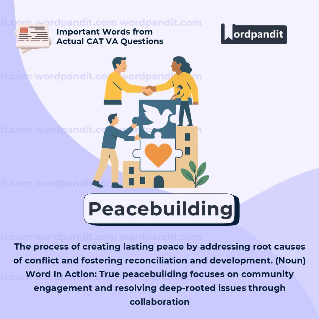 This is a high-utility word in international relations, sociology, and development studies. Remember: peacebuilding â peacekeeping. The former is deeper, slower, and more structural. Ideal for essays on conflict, governance, or community work.