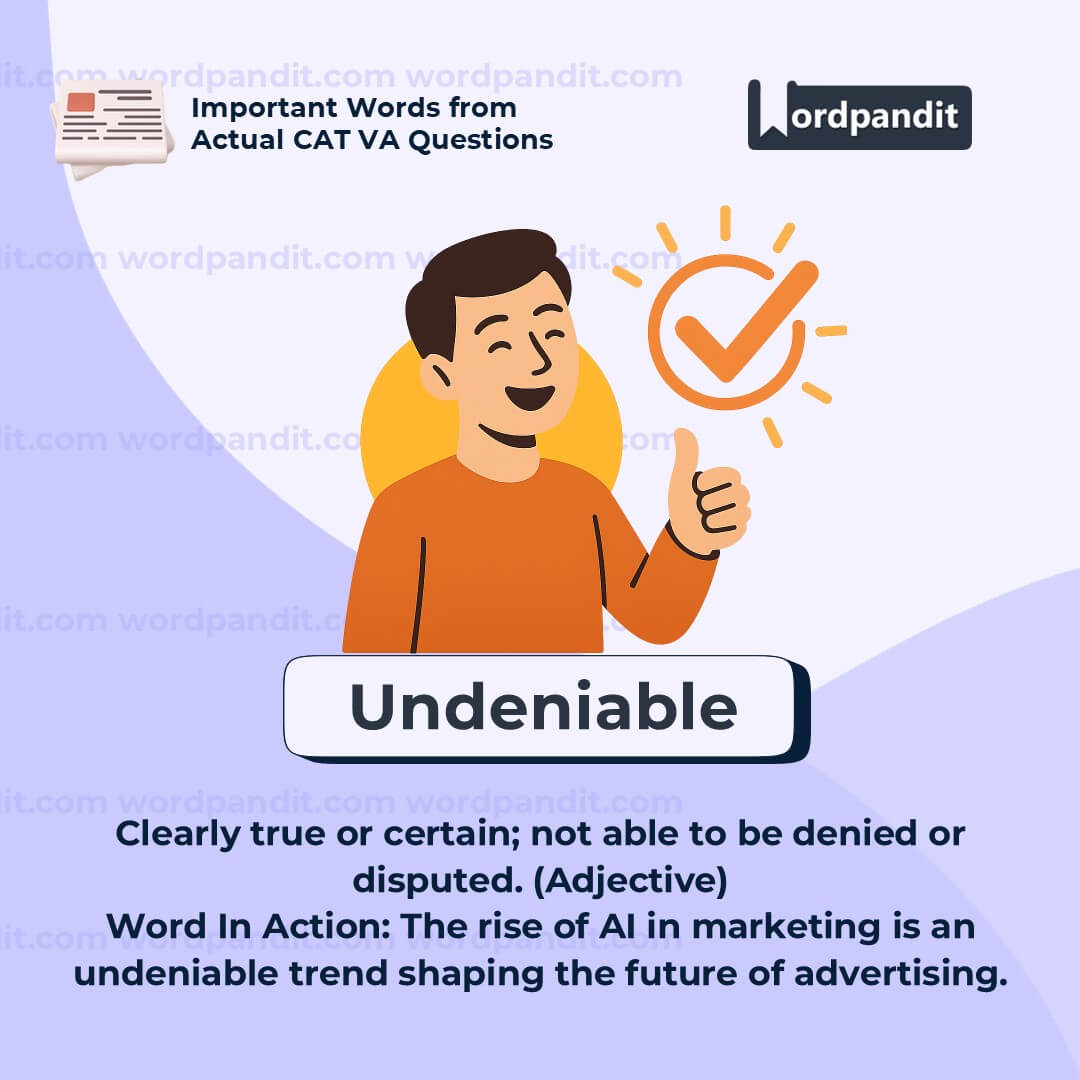 Undeniable = âcanât deny it.â If no one can reasonably say âno,â itâs undeniable.