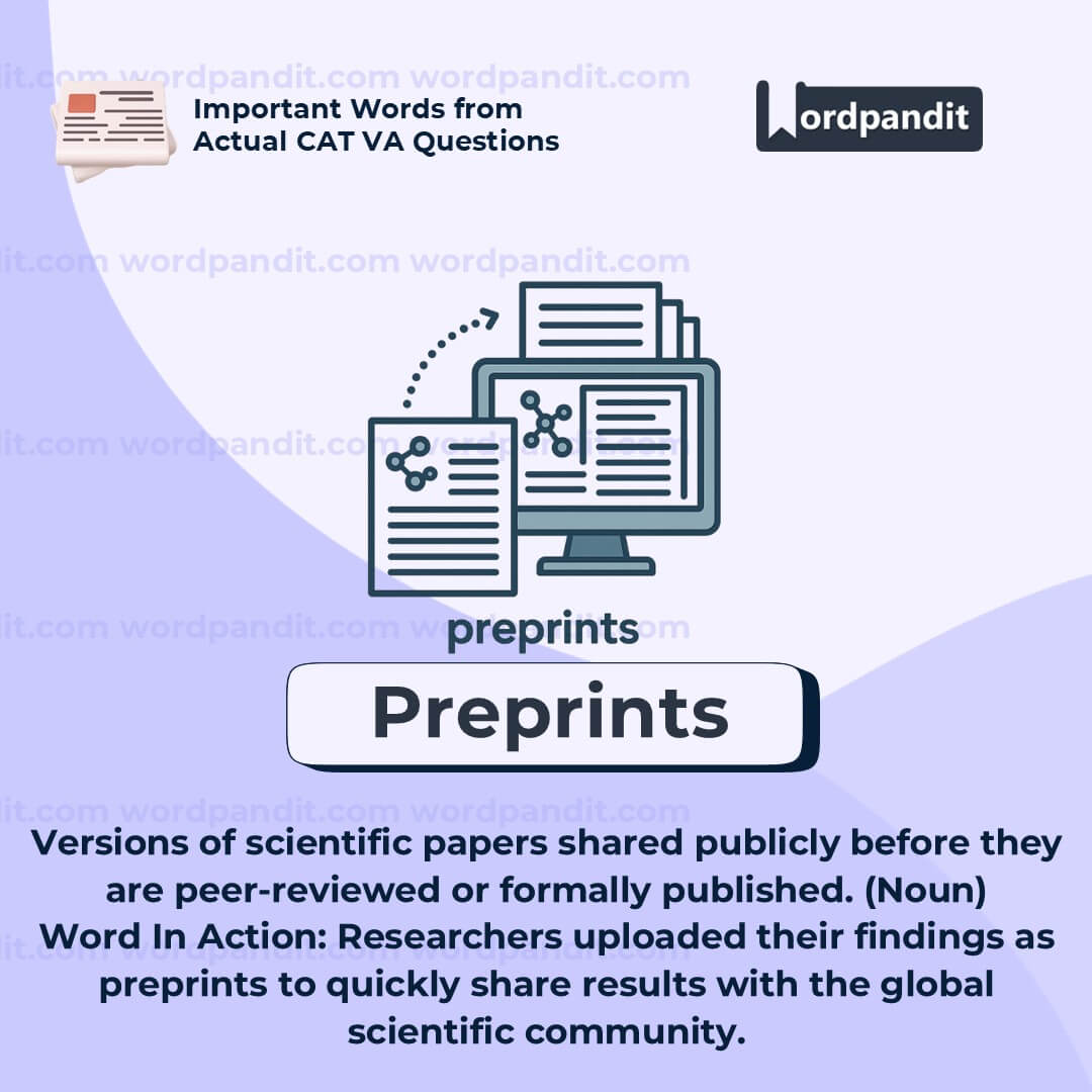 "Preprints" are versions of research papers shared publicly before they undergo formal peer review and are published in academic journals. They allow researchers to get feedback early, make their work accessible, and accelerate the communication of new findings. While not yet certified by traditional review processes, preprints have become a valuable tool in the scientific community, particularly in fast-moving fields like medicine and physics.