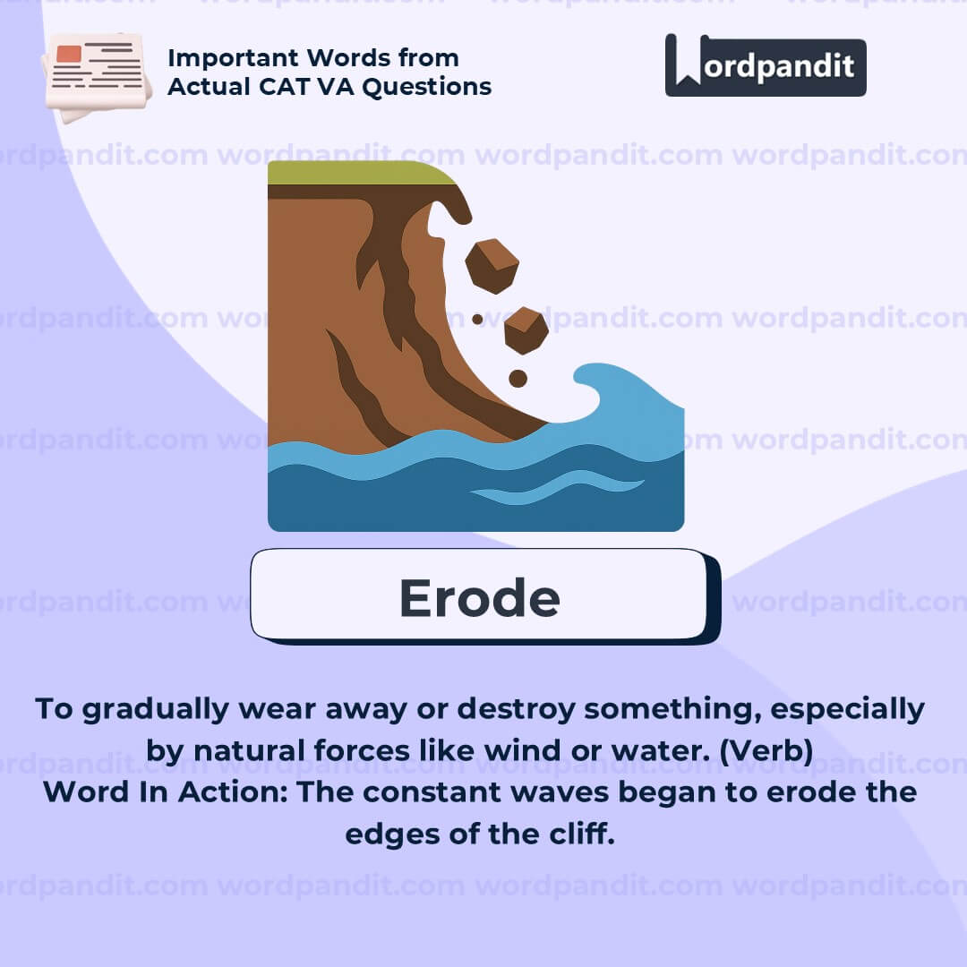 âErodeâ is often used in abstract settingsâvalues, trust, or identity can be eroded over time. It suggests slow, often unnoticed, damage that accumulates over a period.