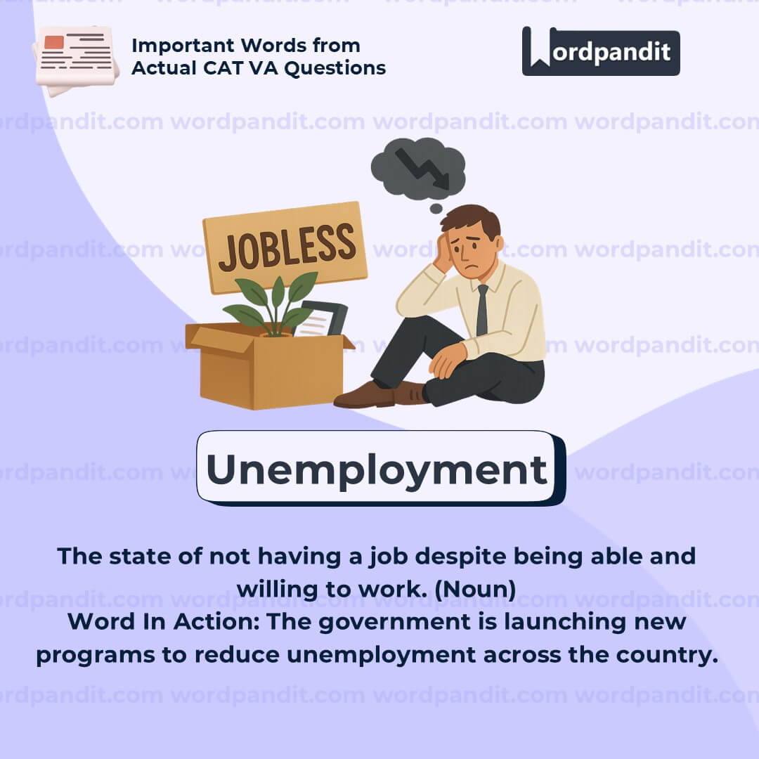 Break the word: âUnâ (not) + âEmploymentâ (work) = Not having work = Unemployment.