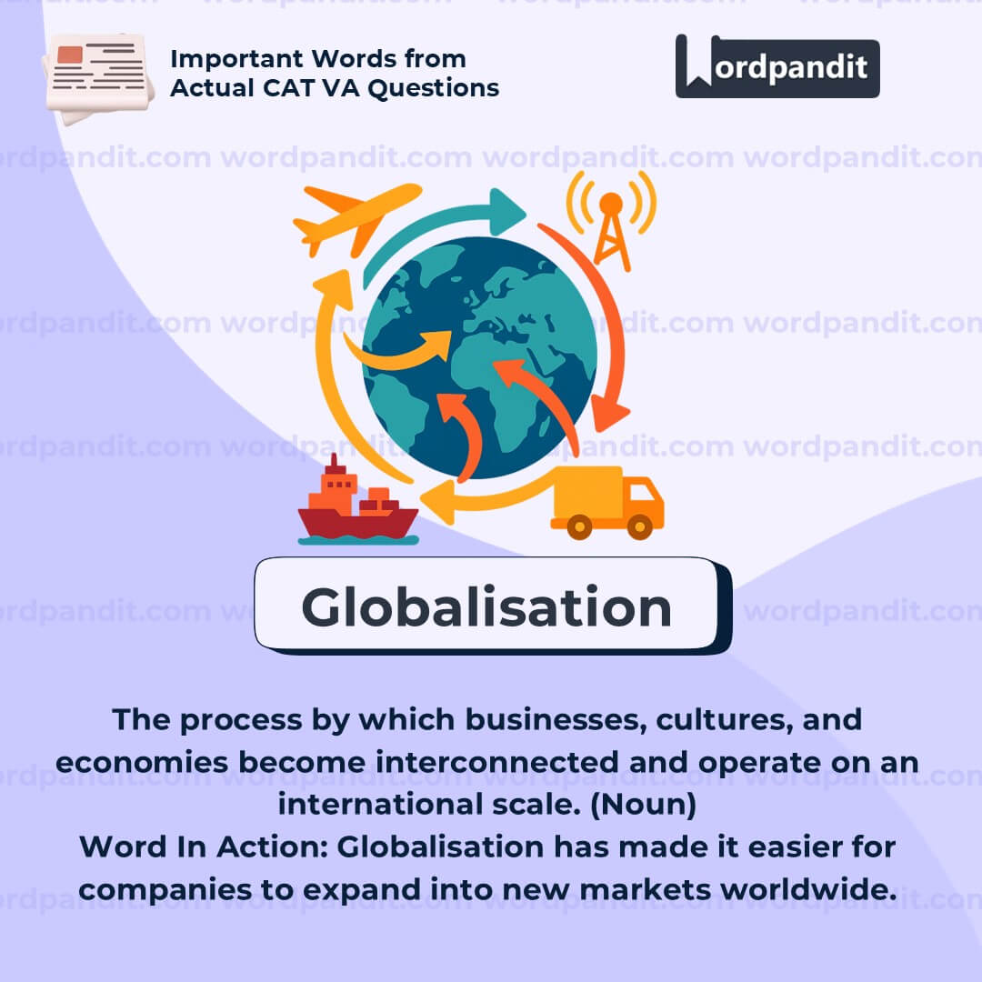 This is a high-utility word in economics, sociology, and political science. It's vital to understand both the positive and negative sides of globalisation. Try to link the term with real-life scenariosâlike global trade, outsourcing, or cultural exchange through social media.