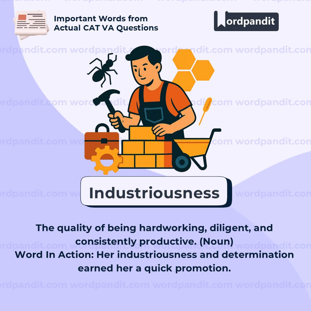 Link it to "industrial" — think of machines working tirelessly. Industriousness is like a well-oiled human engine of effort!