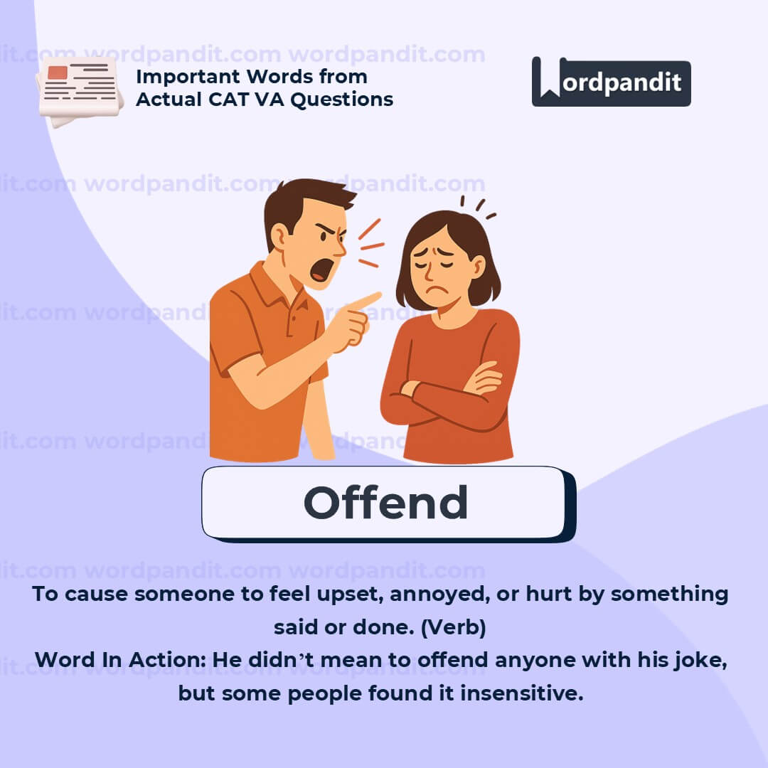 "Offend" is commonly used in discussions of free speech, social media content moderation, and interpersonal communication. Understanding it is crucial for navigating debates on tolerance, sensitivity, and expression.