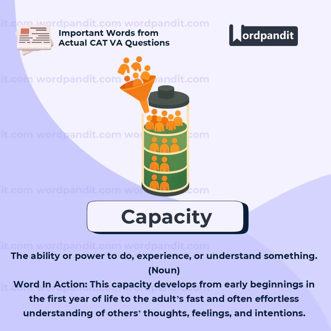 “Capacity” refers to the ability or potential to do something. It can be physical, mental, emotional, or even organizational. In this context, it highlights a cognitive or psychological ability — the human potential to understand the minds of others. The sentence traces the gradual development of this capacity from infancy to adulthood, emphasizing how complex and essential it becomes in everyday life.