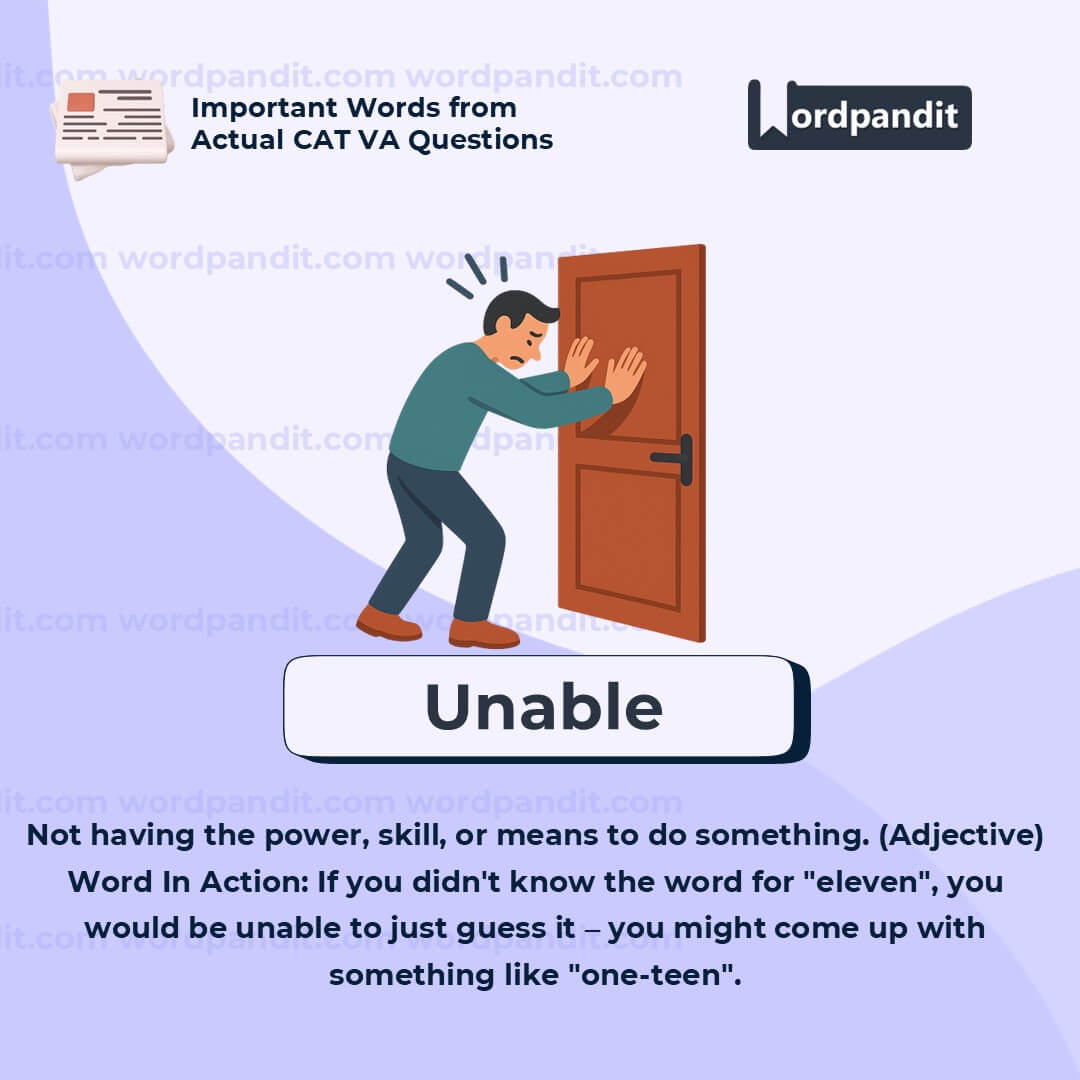 “Unable” = “un” (not) + “able” (capable) → just remember: *not able* to do something. Simple and direct!