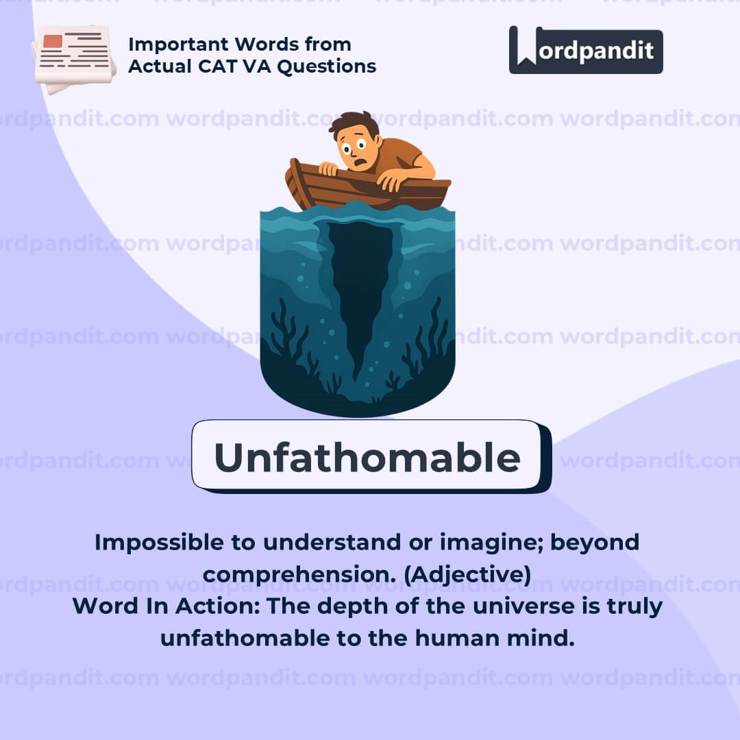 Break the word into âun-â (not) + âfathomâ (to understand or measure depth). Think of a submarine trying to measure the bottom of the Mariana Trenchâit's so deep, itâs unfathomable!