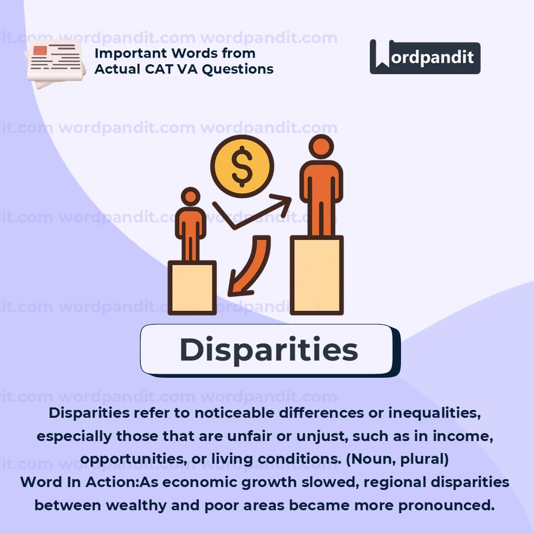This word often appears in exam passages and essays relating to social and economic inequality. When analyzing the word, think about what specific kind of disparity is being discussedâeconomic, gender-based, geographic, or educational. It's always linked with contrast and inequality.