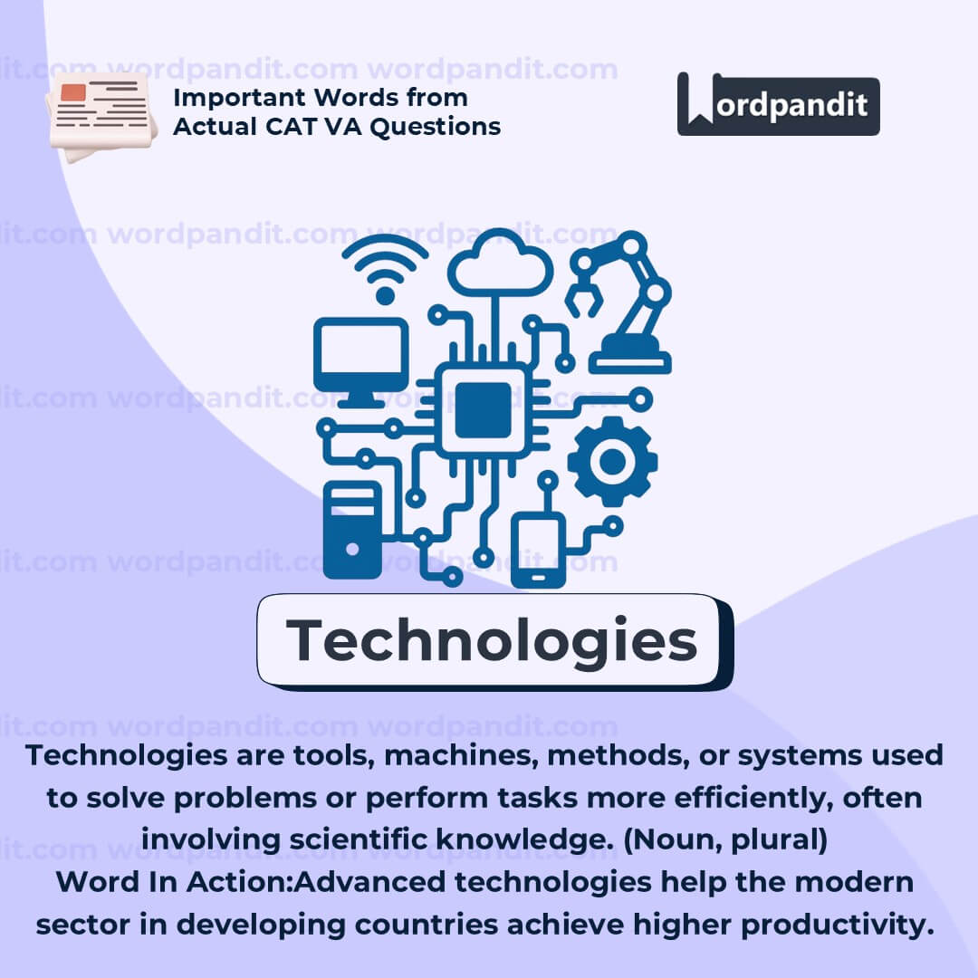 âTechnologiesâ often appears in discussions about growth, development, and change. The word is plural, so always use plural verbs with it. Itâs useful across topicsâscience, education, agriculture, and business. When analyzing essays or articles, think about what kinds of technologies are being discussed: digital, mechanical, biological, etc.