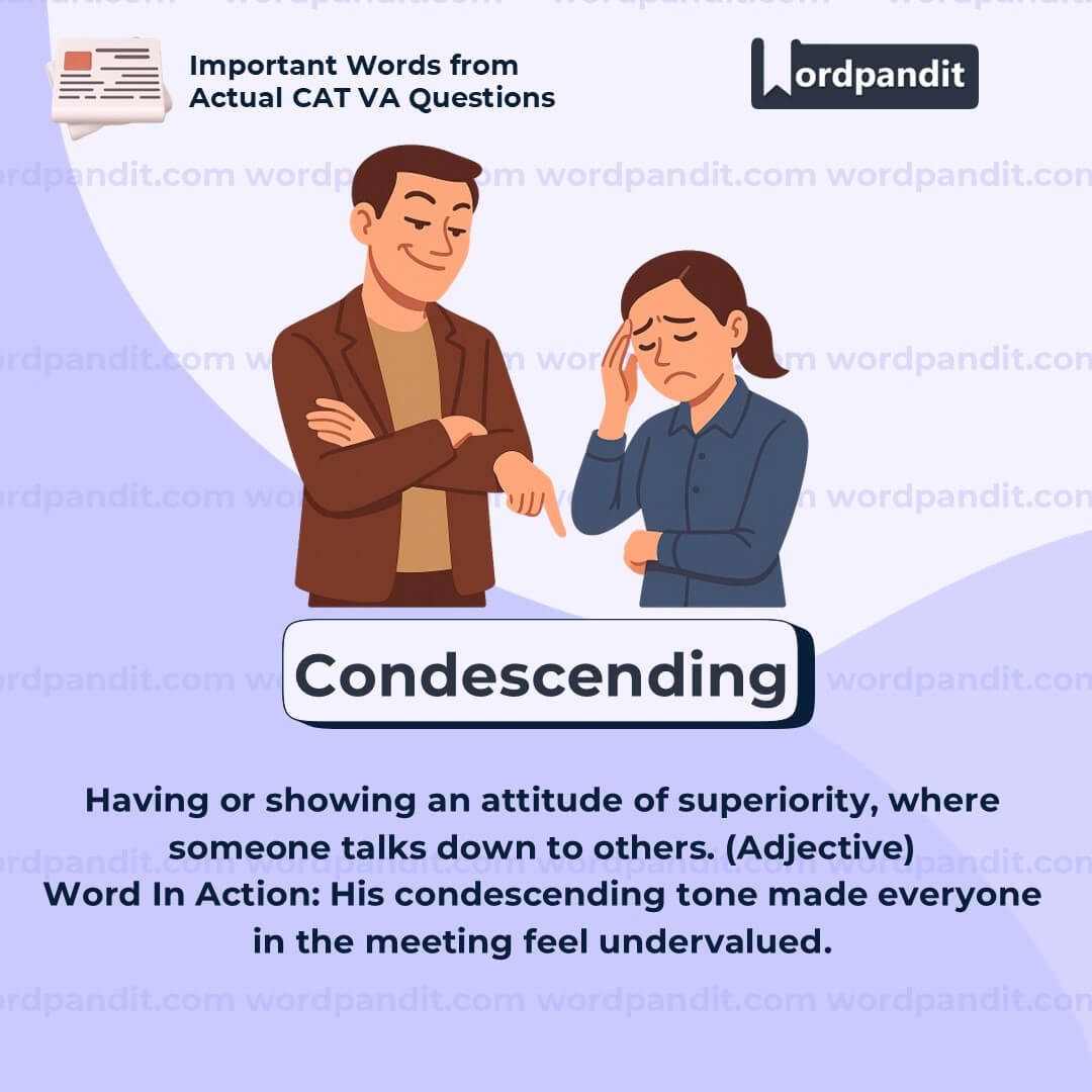 Think: *Condescending = Coming down from a higher place* â Imagine someone looking down from a ladder, thinking theyâre better than you.