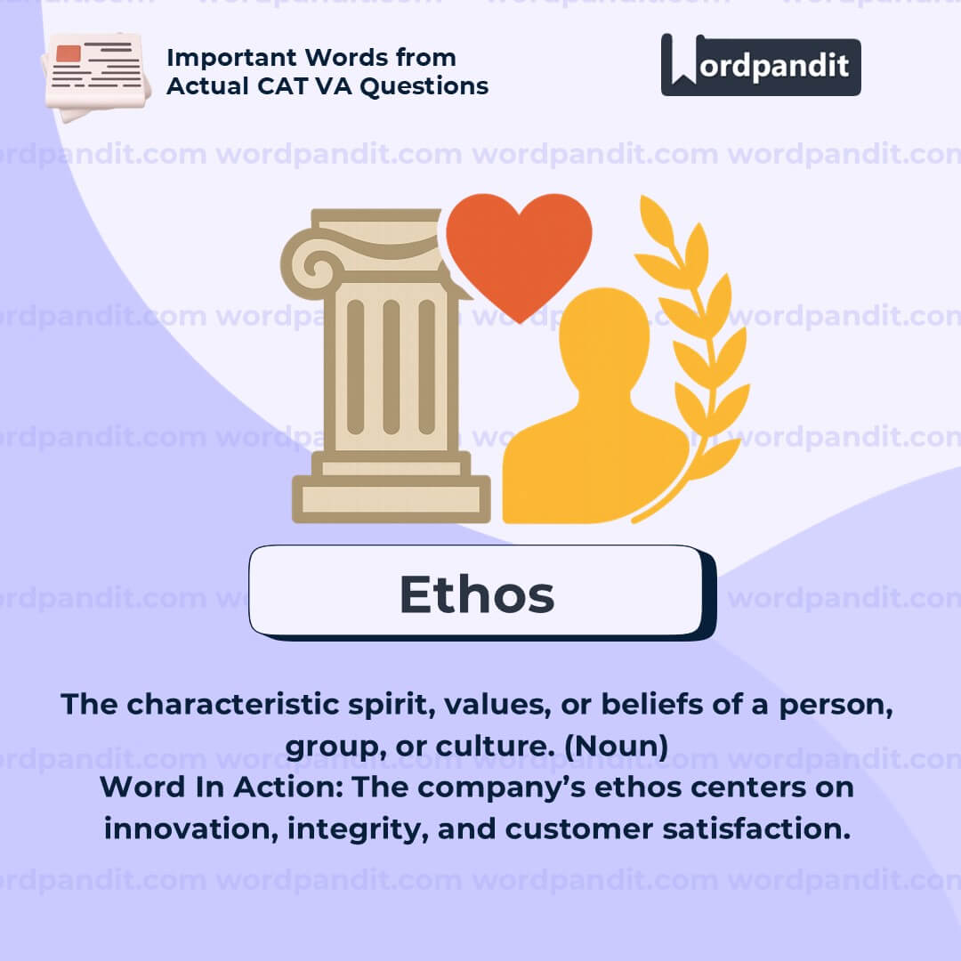 Think: *Ethos = Ethics + Character* â Itâs what defines the soul or guiding values of a group or person.