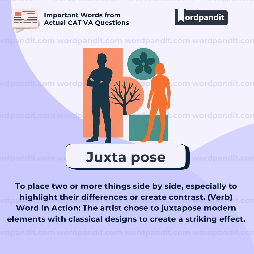 This is a commonly tested academic and literary word. Itâs used frequently in analytical writing and essays. Remember: "juxta" means beside â so juxtapose means putting beside to compare or highlight.