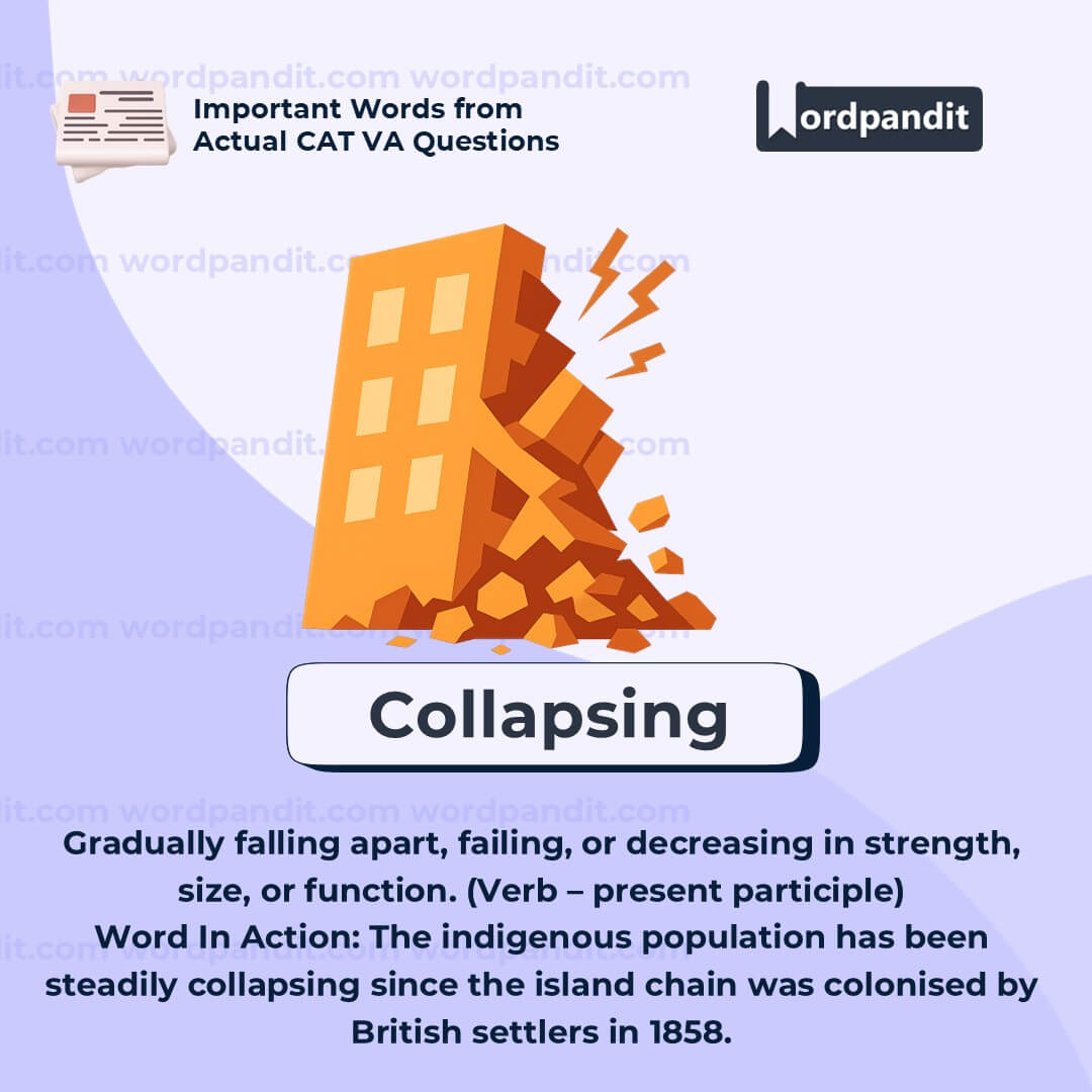 “Collapsing” refers to the process of falling down, crumbling, or failing suddenly or gradually. While it can describe physical structures (like a building collapsing), in this context, it’s used metaphorically to describe a population that is drastically shrinking or deteriorating. The sentence highlights how colonization, disease, and displacement contributed to the slow disintegration of the indigenous community over generations, leading to cultural loss and demographic decline.