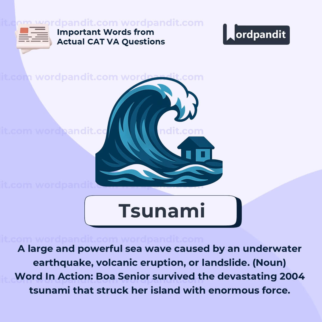 “Tsunami” refers to a large and powerful sea wave caused by the sudden displacement of water, usually due to an undersea earthquake, volcanic eruption, or landslide. Unlike regular waves, tsunamis can travel across oceans at high speeds and strike coastlines with devastating force, causing massive flooding, destruction, and loss of life. In the given context, Boa Senior survived the catastrophic 2004 Indian Ocean tsunami, one of the deadliest natural disasters in modern history.