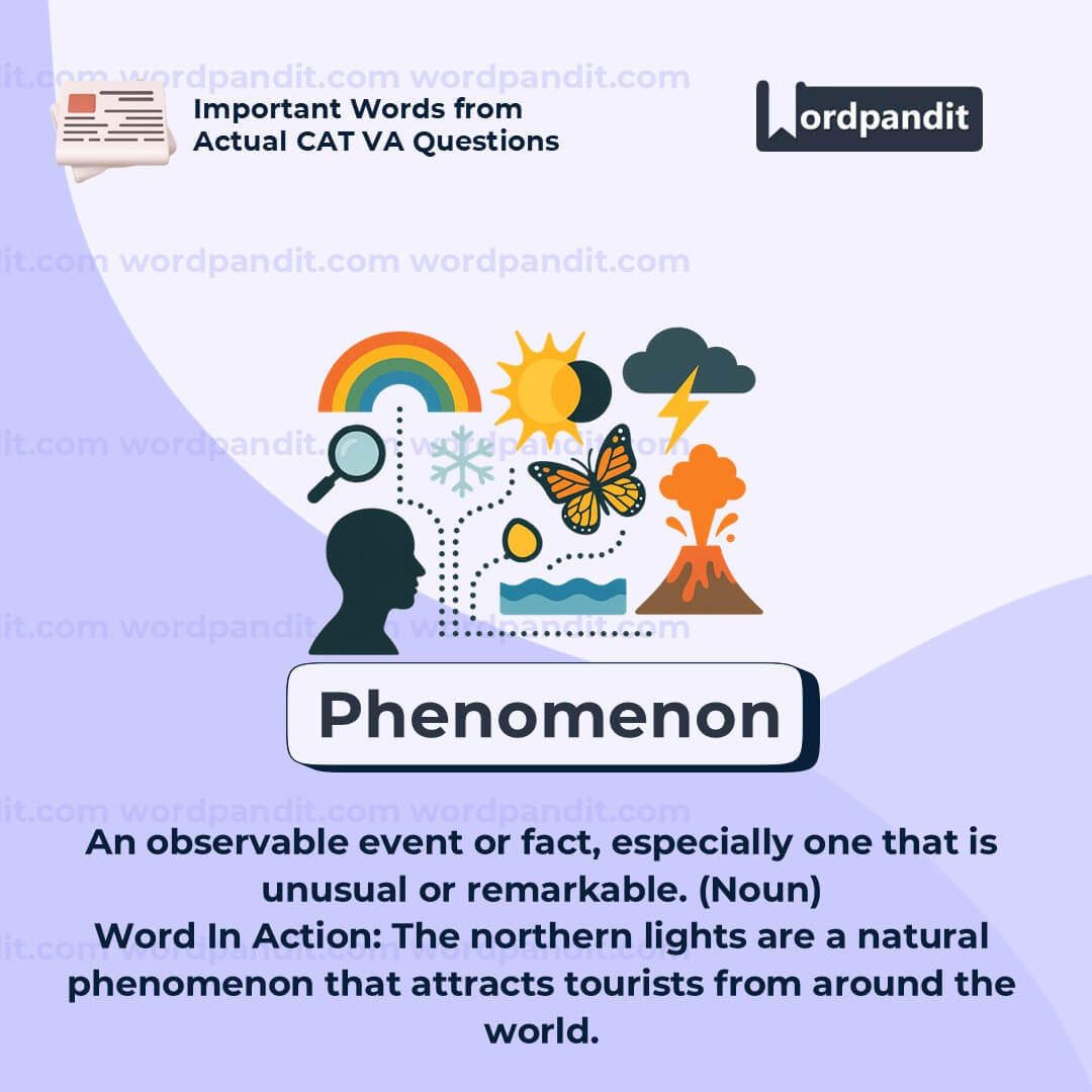 Use âphenomenonâ to highlight complex or extraordinary things that are noticeable in the worldâwhether in society, science, nature, or culture. Its plural is âphenomena,â which students often mix up. This word is excellent for analytical writing, especially when discussing patterns or large-scale trends.
