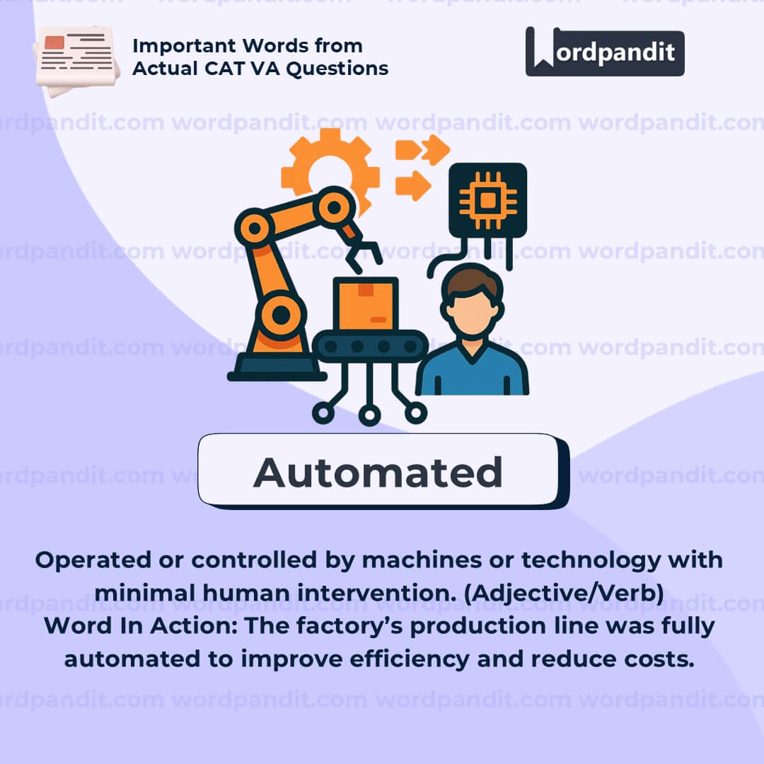 The word "automated" is central to modern industries and often appears in technology-related texts. Think of it as a shortcutâmachines doing what humans used to do, faster and more efficiently. This word shows up a lot in articles about AI, robotics, and factory innovations.