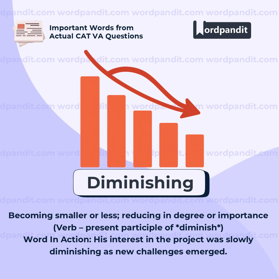 Meaning: Becoming smaller or less; reducing in degree or importance (Verb â present participle of *diminish*)