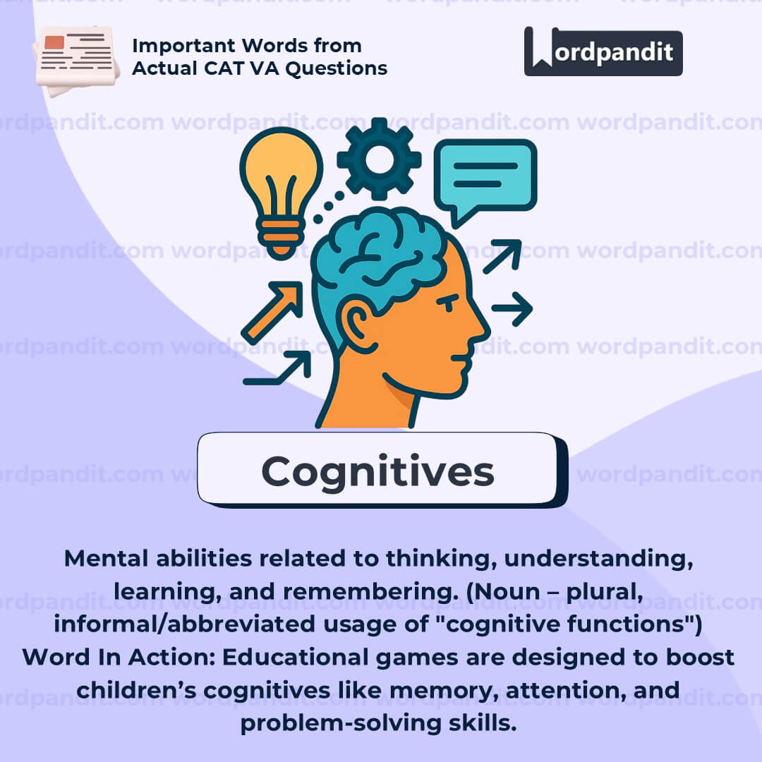 Though "cognitives" isn’t standard as a noun in itself, it's often used in shorthand by professionals discussing test results or mental skills. You’ll find the word “cognitive” used far more frequently as an adjective (e.g., cognitive skills, cognitive development). Keep your ears open for its use in science and education!