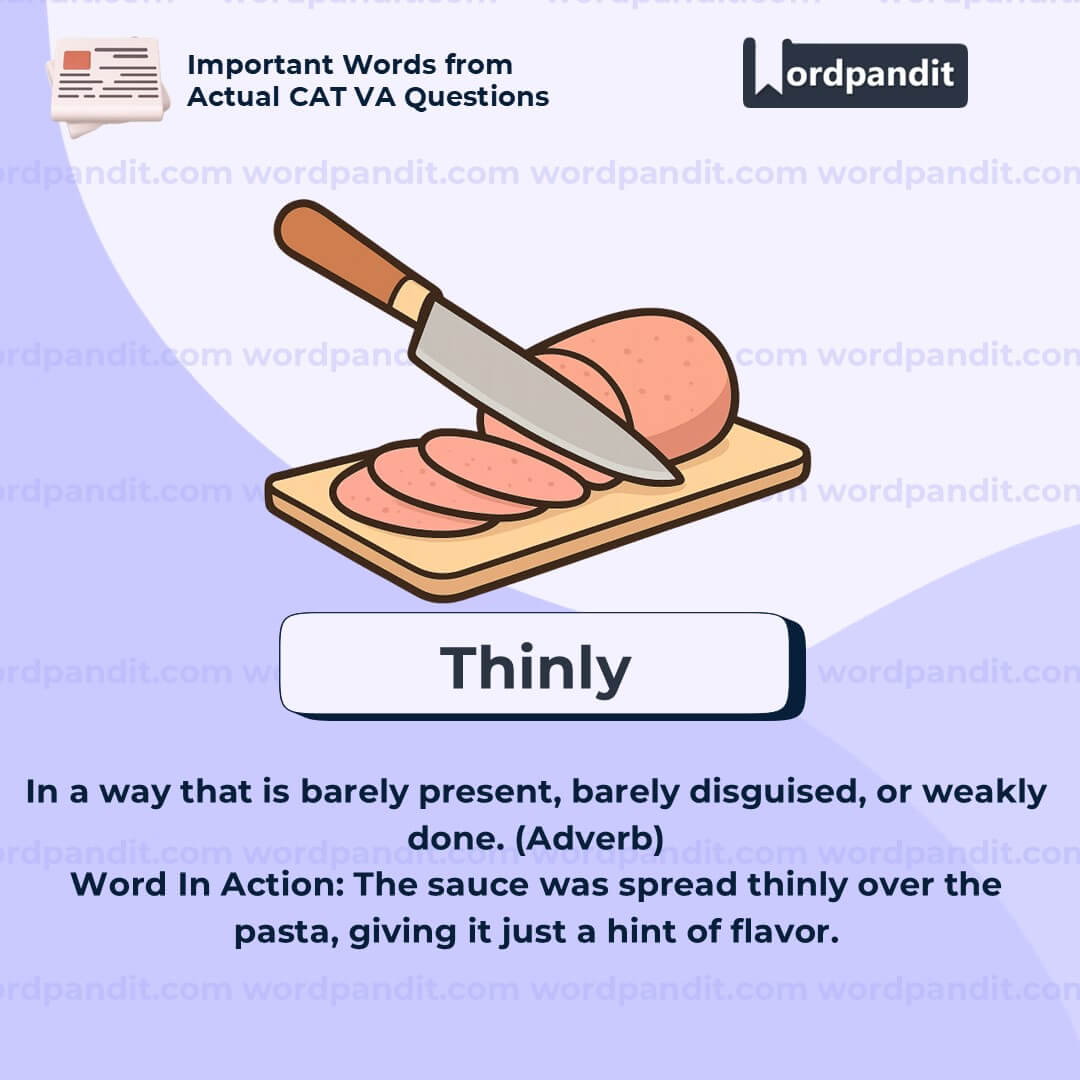 “Thinly” is often used in layered expressions like “thinly veiled,” “thinly spread,” or “thinly disguised.” These idioms are common in journalism, criticism, and formal writing. Recognize its subtle tone—it often signals skepticism or criticism.