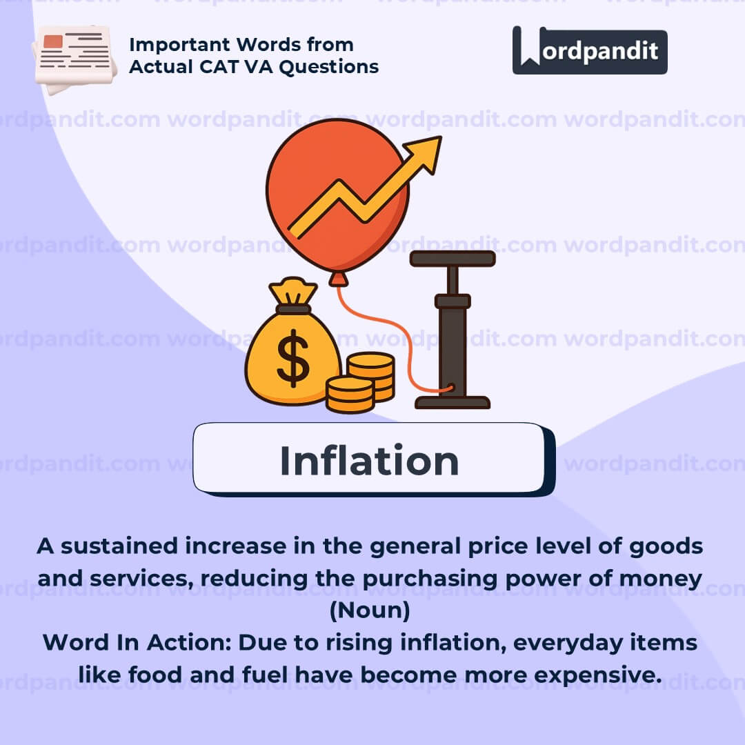 Meaning: A sustained increase in the general price level of goods and services, reducing the purchasing power of money (Noun)