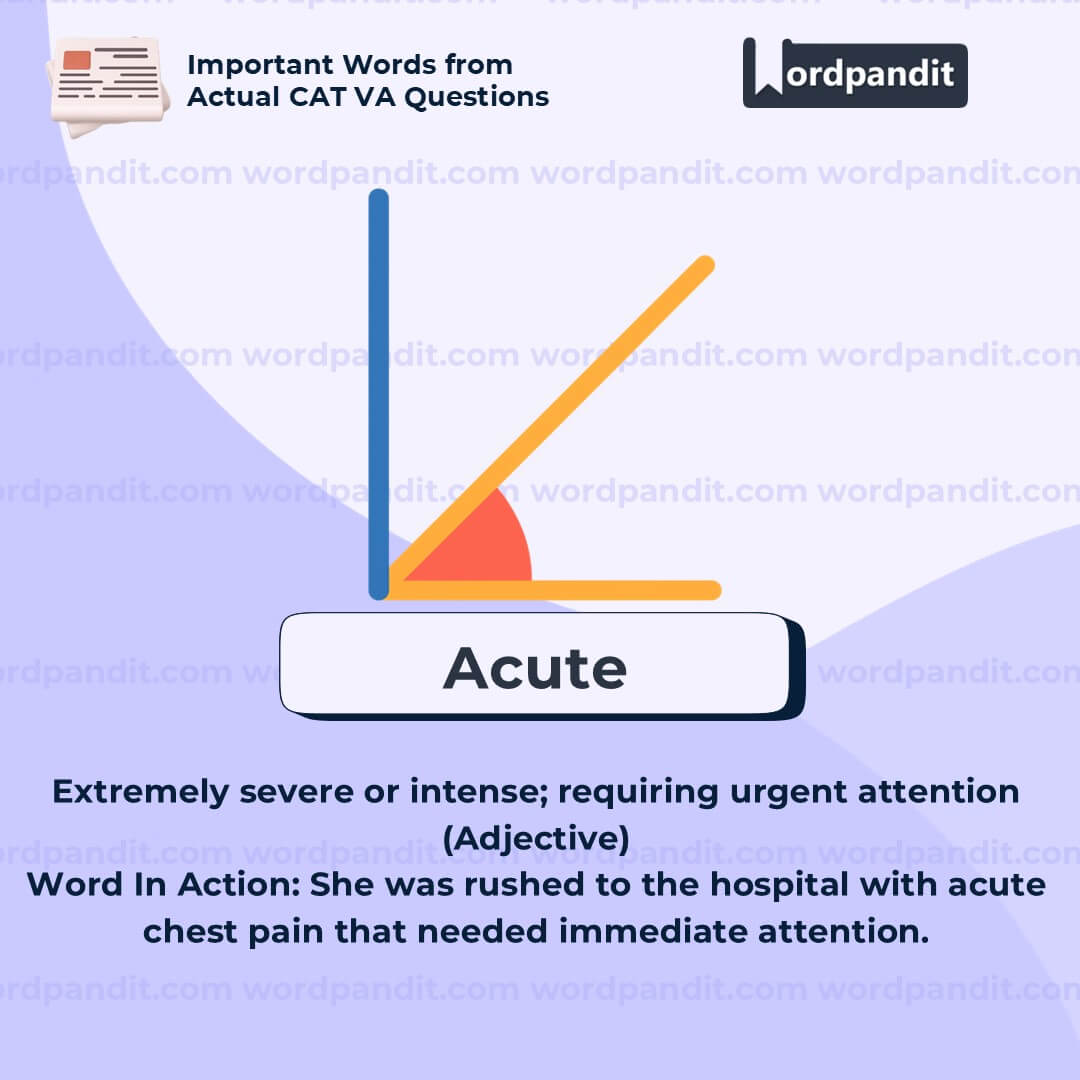 "Acute" is used in medicine (acute illness), economics (acute inflation), and humanitarian aid (acute hunger). Recognizing an acute problem means knowing when immediate action is needed to prevent long-term damage or loss of life.
