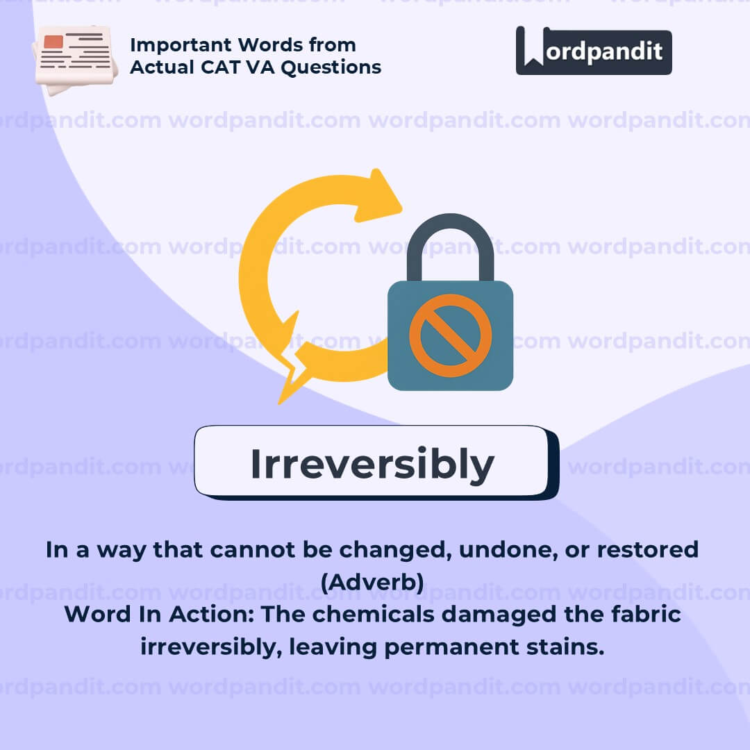 "Irreversibly" is used in journalism, science, economics, and even law to stress outcomes that canât be undoneâlike species extinction, deforestation, or wrongful convictions. It helps mark the point where prevention gives way to loss.