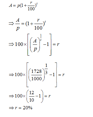 Question 2: An amount of Rs 1000 amount equates to Rs 1728 in 3 years when interest is compounded annually. What will be the rate per annum?