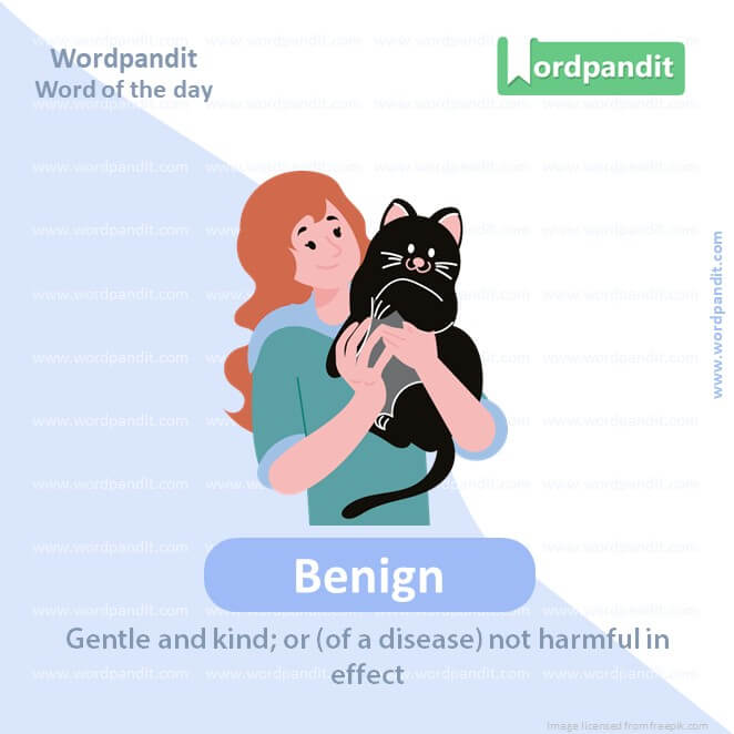 Synonyms: Kindly, benevolent, kind-hearted, harmless, non-malignant, mild, gentle.