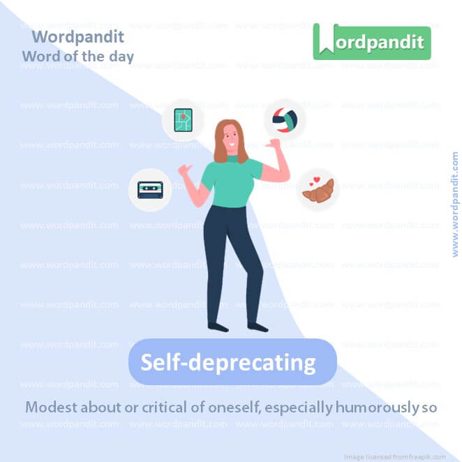 Meaning: Modest about or critical of oneself, especially humorously so.
