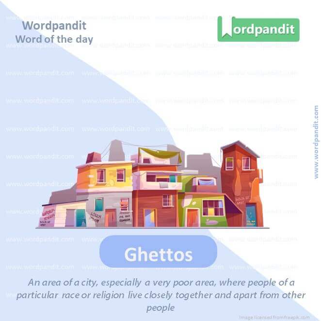Meaning: An area of a city, especially a very poor area, where people of a particular race or religion live closely together and apart from other people.