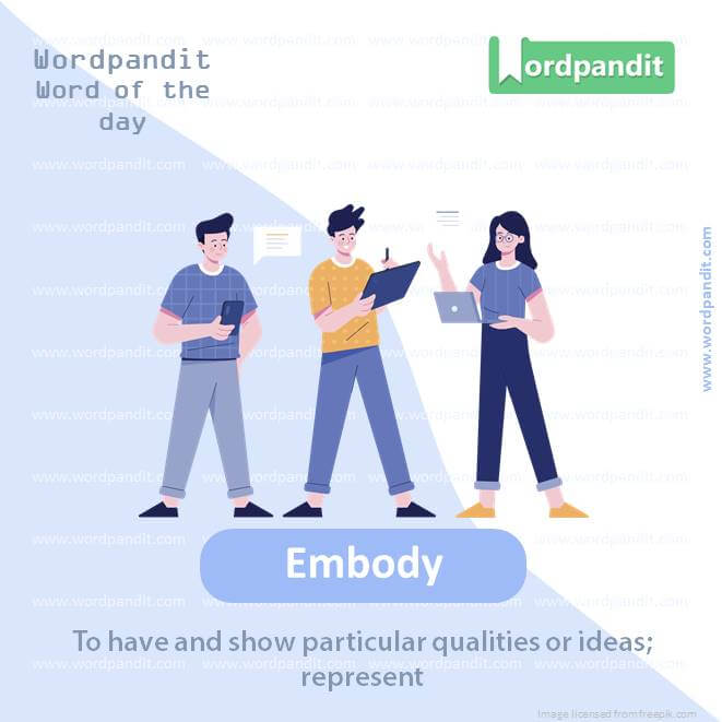 Synonyms: Demonstrate, epitomize, exemplify, exhibit, express, illustrate, incorporate, manifest, mirror, personify, realize, stand for, symbolize, typify, etc.