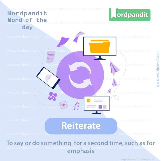 Synonyms: Echo, renew, repeat, restate, ditto, double-check, ingeminate, iterate, recap, recapitulate, rehash, etc.