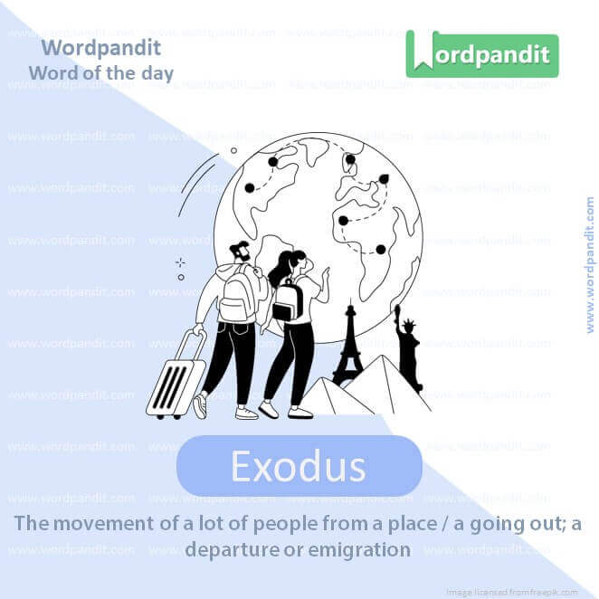 Meaning: The movement of a lot of people from a place / a going out; a departure or emigration.