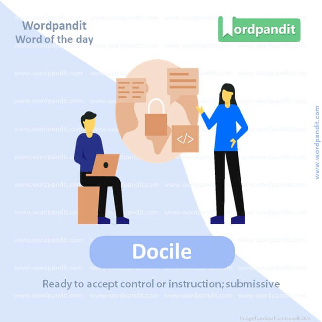 EXPLANATORY PARAGRAPH: Docile means someone or something is easy to handle or control. Like a very well-behaved pet that listens to your commands, that’s docile.