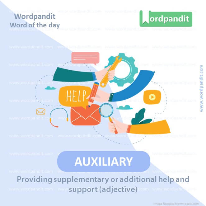 EXPLANATORY PARAGRAPH: Auxiliary means something that helps or supports. Imagine you have a small toy that helps your big toy in a game; that small toy is like an auxiliary to the big one.