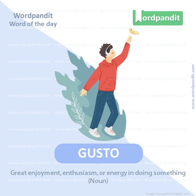 EXPLANATORY PARAGRAPH: Gusto is when you do something with a lot of excitement and happiness. Like when you jump into a swimming pool shouting “Yay!” or eat your favorite ice cream really, really happily, you’re doing it with gusto!