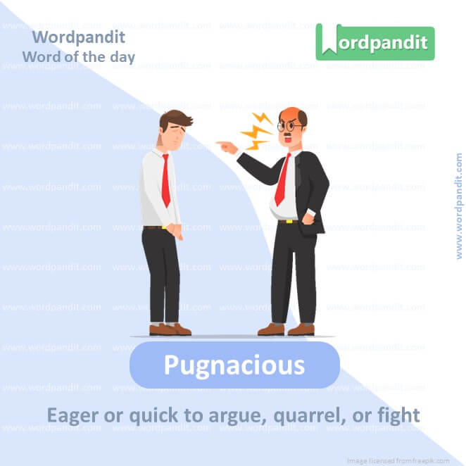 EXPLANATORY PARAGRAPH: Pugnacious means someone who likes to fight or argue a lot, like a feisty little puppy who always wants to play-fight. It’s important to be friendly and not pugnacious, so people like being around you.