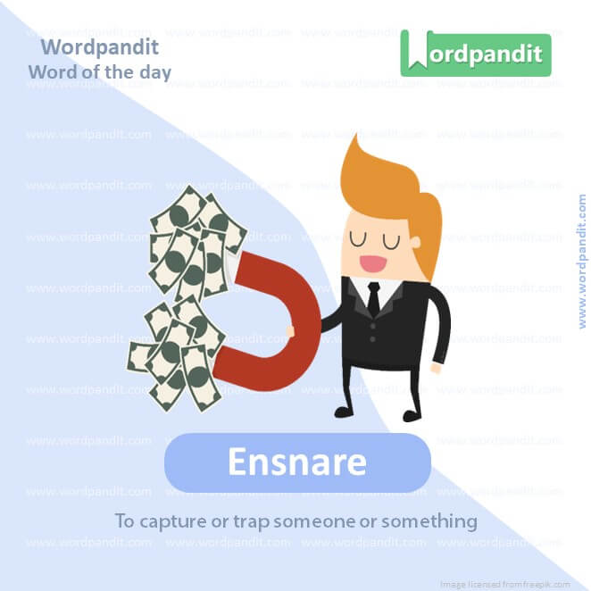 EXPLANATORY PARAGRAPH: Ensnare is like when someone gets stuck in a spider’s web. It means to attract or trap someone, usually by trickery or deceit.