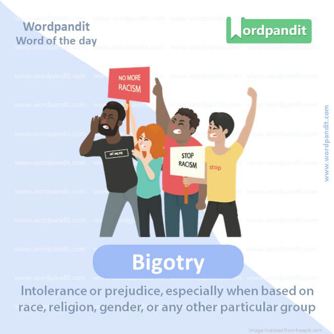 MEANING: Intolerance or prejudice, especially when based on race, religion, gender, or any other particular group (noun).