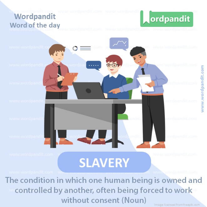 MEANING: The condition in which one human being is owned and controlled by another, often being forced to work without consent (Noun).