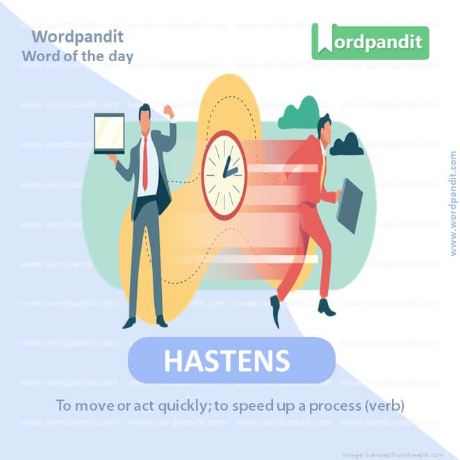 EXPLANATORY PARAGRAPH: ‘Hastens’ means to go really fast or to make something happen sooner. Like when you’re running super fast because you can’t wait to get to the playground!