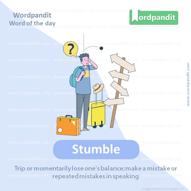 MEANING: Trip or momentarily lose one’s balance;make a mistake or repeated mistakes in speaking