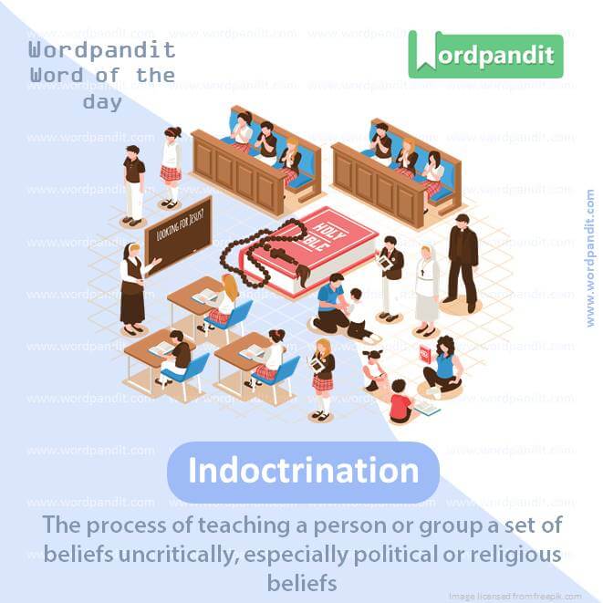 EXPLANATORY PARAGRAPH: Imagine someone teaching you a set of rules or beliefs and saying that you must always follow them without question. That’s like “indoctrination.” It means teaching someone to accept a particular set of beliefs or ideas without questioning them.