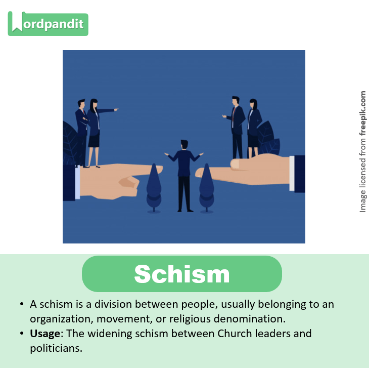 • A schism is a division between people, usually belonging to an organization, movement, or religious denomination.