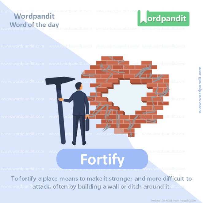 Meaning: To fortify a place means to make it stronger and more difficult to attack, often by building a wall or ditch around it.