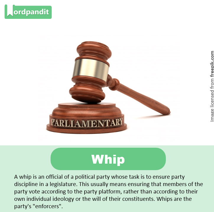 • a) [Noun] A whip is an official of a political party whose task is to ensure party discipline in a legislature. This usually means ensuring that members of the party vote according to the party platform, rather than according to their own individual ideology or the will of their constituents. Whips are the party’s “enforcers”.